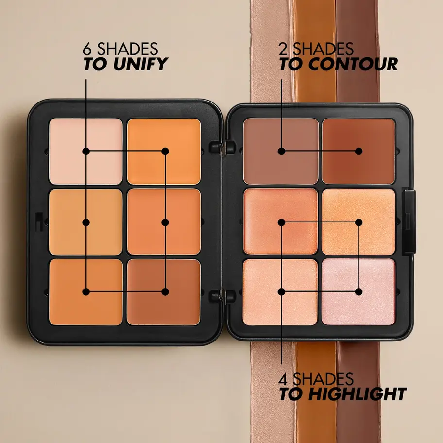 تأتي كل لوحة مع اثنتي عشرة تركيبة متعددة الاستخدامات، تضم ستة ألوان موحدة (من الأول إلى السادس)، وكريمين لتحديد الوجه (من السابع والثامن)، وأربعة ألوان هايلايتر مُشرقة (من الثامن إلى الثاني عشر). مثالية لإطلالة ساحرة أينما كنتِ، تُسهّل هذه اللوحة طويلة الأمد الحصول على قاعدة منحوتة مثالية، كل ذلك في علبة واحدة مدمجة.